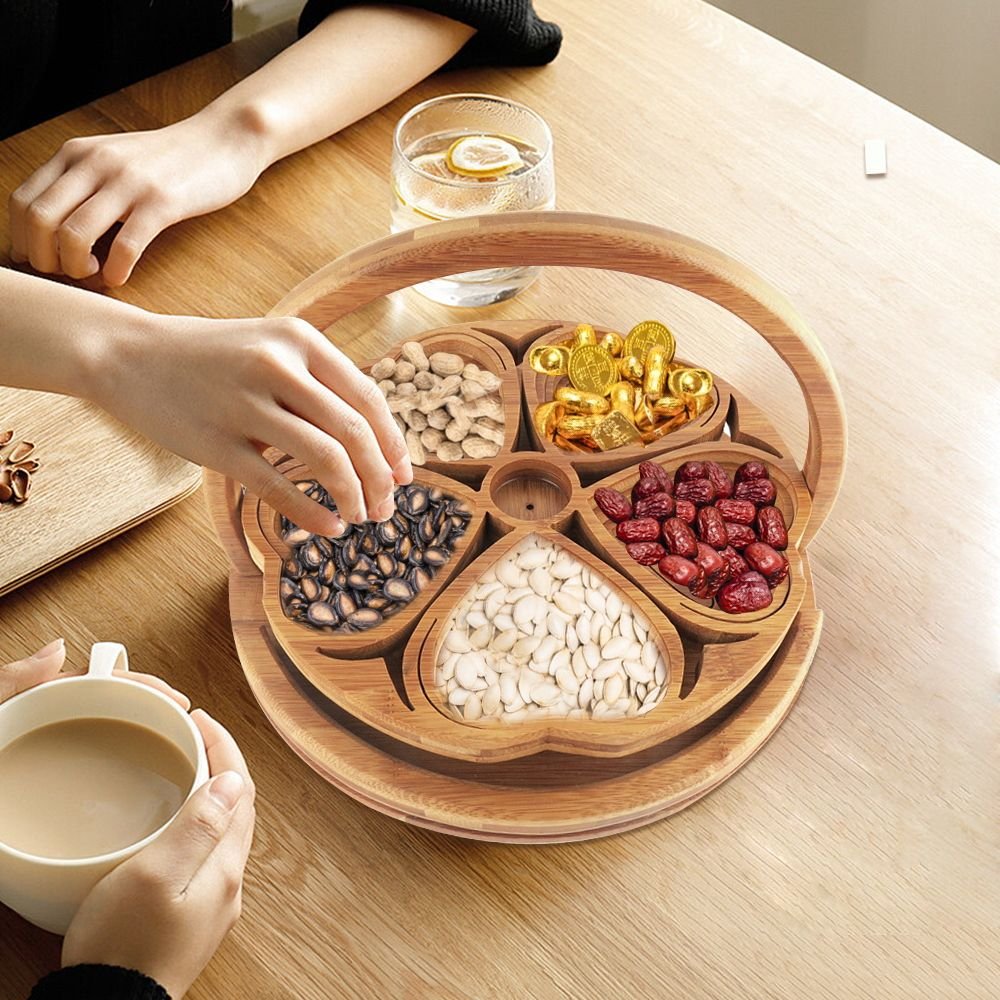 Home > Bamboo Foldable Fruit Storage Basket Creative Collapsible Fruit Candy Plate Nuts Snacks StorageTray Home Decoration Gift Basket